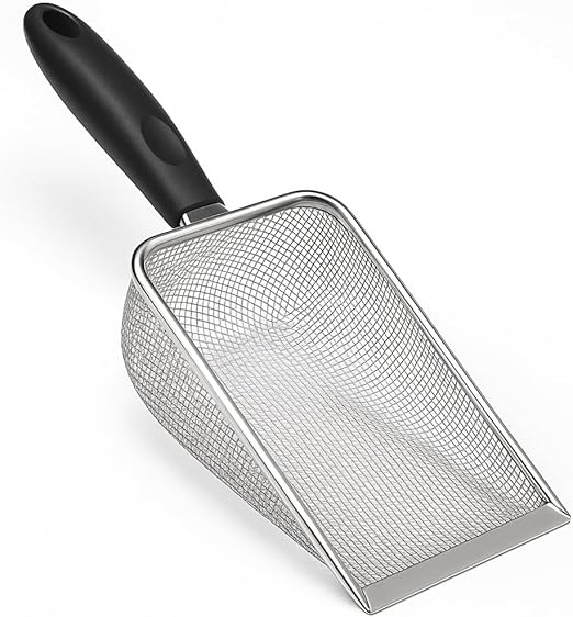 Construída em aço inox, a pá oferece uma estrutura firme que não se dobra ou entorta com uso constante. A combinação de material robusto com uma peneira bem desenhada promete durabilidade superior frente às peças plásticas comuns. A peneira, com furos ajustados, retém fezes e torrões mantendo a areia mais limpa por mais tempo. O cabo ergonômico facilita a pegada, tornando o ato de varrer os resíduos mais tranquilo, especialmente em caixas de areia maiores ou com profundidade significativa.