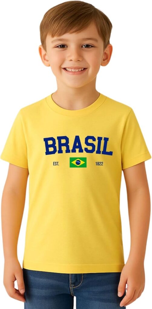 O tecido é o diferencial básico desta camiseta: confeccionada em 100% algodão de peso médio, o que costuma oferecer toque macio e boa respirabilidade para o dia a dia. O design é simples e direto, com estampa frontal que celebra o Brasil, trazendo o nome BRASIL em destaque acompanhado pela bandeira nacional. A gola redonda e as mangas curtas mantêm o visual tradicional, com ajuste regular que funciona bem para crianças, sem exigir tamanho específico para cada ocasião de uso. A peça é descrita como não elástica, com acabamento reto na barra, o que conserva a aparência alinhada mesmo após várias lavagens.