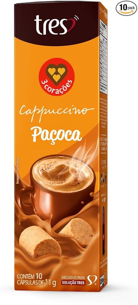 - Por que vale a pena: cápsula fácil de usar, sabor Paçoca que agrada quem curte cappuccino adocicado; embalagem de 10 cápsulas; compatível com máquinas TRES; embalagem reciclável e BPA-free; frete grátis para pedidos acima de R$19.