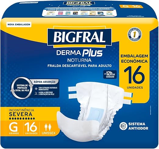 A Bigfral Derma Plus Noturna Economica G 16 Unidades aparece na Amazon com preço de R$55,30, caindo 14% frente aos R$64,90 anteriores. A oferta chega junto de entregas com envio grátis para clientes que acompanham a plataforma, tornando o conjunto uma opção atrativa no cuidado noturno para adultos com necessidade de proteção extra durante a noite. São 16 unidades, pensadas para quem busca reposição periódica sem pesar no bolso, especialmente em quem convive com incontinência urinária de maior severidade.