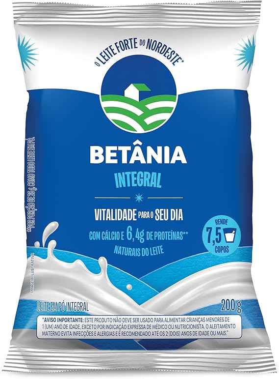 O leite em pó Betânia vem no formato compacto de 200 g, pensado para uso rápido: basta acrescentar o pó em água ou outro líquido e mexer até dissolver. O rótulo informa que o produto é leite integral em pó, com sabor clássico e versatilidade para ser saboreado puro, com frutas, sorvetes ou em preparos simples como achocolatados. Em termos de consumo, o ponto-chave é a praticidade: mantém o teor nutritivo do leite integral, sem a necessidade de refrigeração antes de abrir.