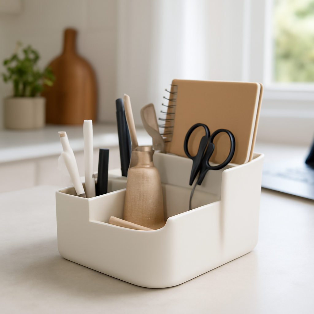 No escritório, use este organizador para separar canetas, clips e pequenos acessórios, evitando pilhas desordenadas. Ele também fica ótimo na bancada da cozinha, agrupando temperos ou utensílios que você usa diariamente, o que torna a rotina mais prática e visualmente leve.