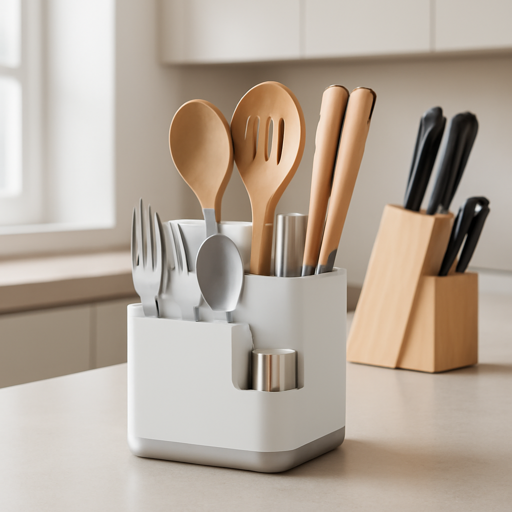 Imagine sua bancada da cozinha com utensílios usados com frequência, como colheres médicas, espátulas e pequenos potes, organizados nesse suporte. Isso facilita o preparo das receitas e mantém a bancada livre para outras tarefas, deixando o espaço sempre pronto para o próximo uso.