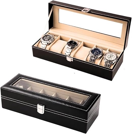 Caixa Organizadora de Relógios com Design Moderno e Minimalista — 6 Compartimentos, Tampa de Vidro, por R$59,87
