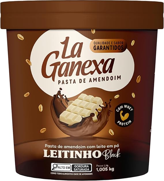 O item é apresentado como pasta de amendoim zero açúcar, com um recheio de chocolate sem adição de açúcar, leite em pó desnatado, creme de leite em pó, cacau, whey protein e edulcorante sucralose. O conjunto resulta em uma textura cremosa, com reforço proteico pela presença de whey e um toque de chocolate que não eleva o açúcar. O rótulo ainda destaca que o amendoim é fonte natural de vitamina E e ômega 3, o que ajuda a transformar o lanche em uma opção mais completa para quem busca nutrição prática. O destaque de “Leitinho Black” sugere uma assinatura de sabor suave, com notas de chocolate branco que trazem doçura sem açúcar adicional. Em resumo, é uma pasta para quem quer sabor, saciedade e uma composição mais próxima de um alimento funcional.