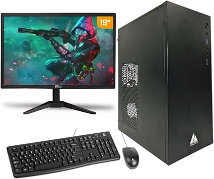 Na tela, o monitor LED de 19 polegadas traz resolução 1440 x 900 a 60 Hz, suficiente para atividades como edição básica de textos, planilhas e fluxo multimídia leve. A combinação tela grande e ângulo de visualização estável facilita a produtividade, ainda que não mire o entretenimento em alta taxa de atualização. O conjunto foca em praticidade: entradas VGA e HDMI no monitor aparecem para conectar facilmente a siglas modernas de origem do conteúdo, enquanto o gabinete acompanha o visual simples porém funcional do PC de uso diário.
