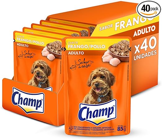 A embalagem do conjunto facilita o controle de porções: são 40 sachês de 85 g, totalizando aproximadamente 3,4 kg de ração úmida em formato prático. O rótulo enfatiza que o Champ Sachê não utiliza conservantes nem corantes artificiais e é apresentado como 100% completo e balanceado para cães adultos, com vitaminas B6, E, C, cobre e zinco, além de um perfil de proteínas e minerais para apoiar a saúde geral do pet.