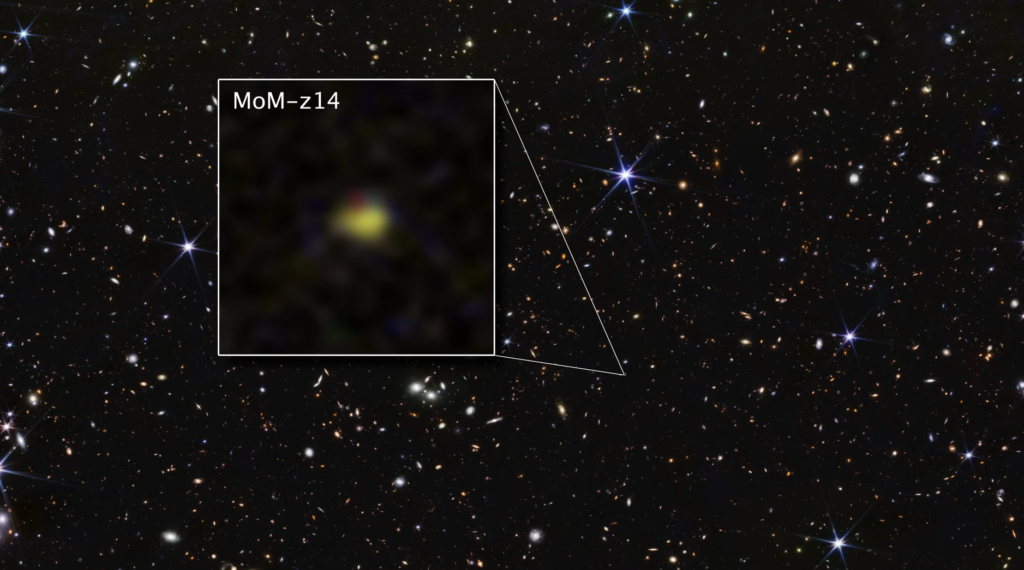 Descoberta da MoM-z14, que emitiu luz 280 milhões de anos após o Big Bang, estabelece novo recorde de observação cósmica.