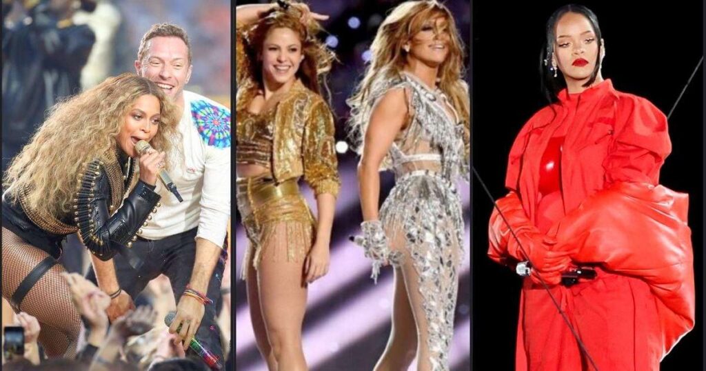 - Rihanna | Super Bowl LVII (2023): a artista retornou aos palcos após um hiato longo e surgiu sobre uma plataforma suspensa, vestida de vermelho, em meio a uma atmosfera que gerou discussões nas redes. Sem discursos adicionais, o visual e a entrega falaram por si só, coroando a gravidez anunciada durante o show. A seleção de hits de diferentes fases da carreira completou o momento histórico com uma estética minimalista e muita presença de palco.