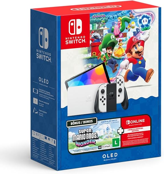 Bundle Nintendo Switch OLED + Super Mario Bros. Wonder + 3 Meses de Assinatura Nintendo Switch Online — R$2.245 com 16% de desconto (De R$2.699,90)