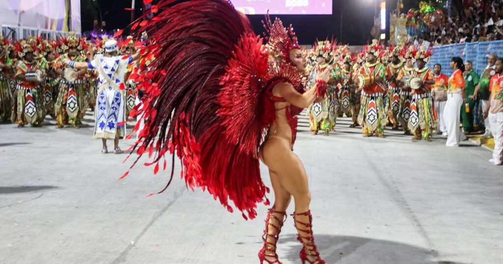 Na sequência, Virginia acabou removendo o costeiro — a peça adicional da fantasia que adicionava peso — destacando que a peça, repleta de plumas vermelhas, pesava cerca de 15 quilos. Além disso, tudo ficou mais intenso pela coincidência de peso e movimento, o que pode justificar, no fim das contas, ajustes rápidos para manter a centralidade do visual sem comprometer a segurança de quem desfila.
