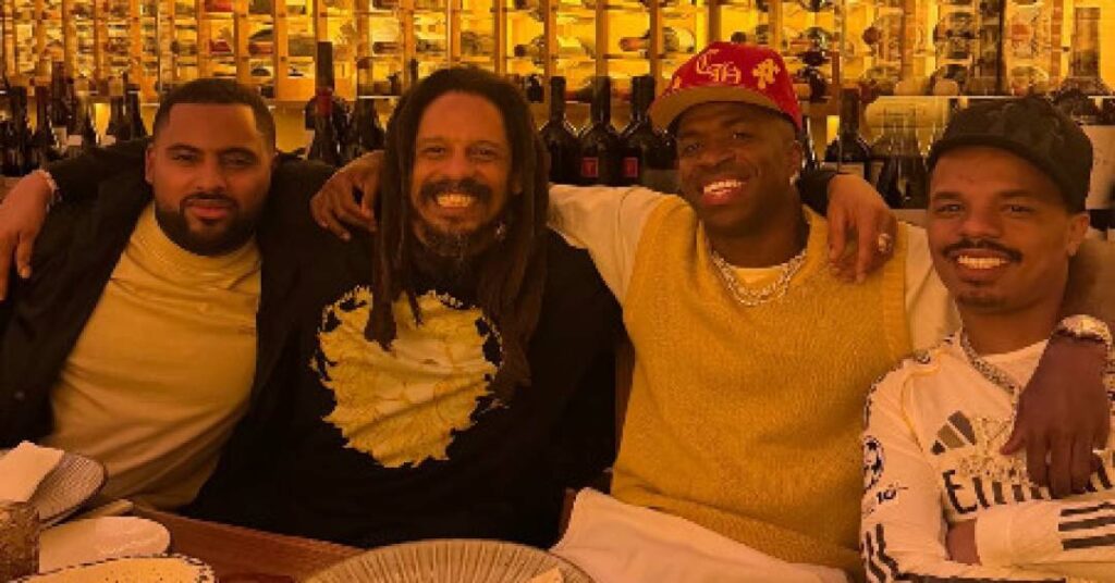 Logo após o apito final, Vini Jr. seguiu para um restaurante em Madrid, acompanhado de ninguém menos que três familiares de Bob Marley.