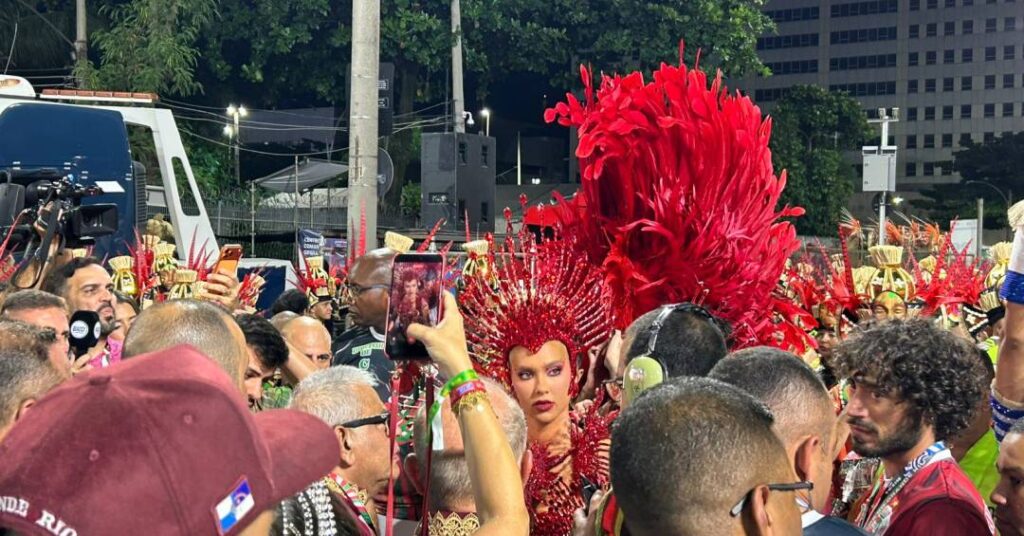 Quase uma hora antes de a Grande Rio entrar na Avenida, Virginia Fonseca, rainha de bateria da escola, apareceu na concentração da Sapucaí cercada por uma dupla de segurança: uma equipe particular e outra da própria agremiação, que afastavam repórteres e fãs de forma firme. O semblante tenso no entorno mostrava que o momento exigia atenção redobrada, já que o grupo se preparava para o desfile.
