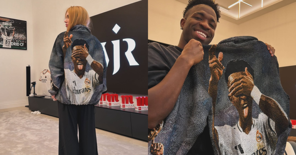 Foi um presente feito sob medida que já chama a atenção entre fãs de moda e entretenimento. A jaqueta traz o retrato de Vini Jr. bordado com capricho nas mangas e nas costas, resultando num visual urbano com toque artesanal. Quem assina o bordado é a estilista Ariadne Lobo, cuja habilidade ficou em evidência no post em que Virginia exibiu a peça ao lado do namorado segurando o look.